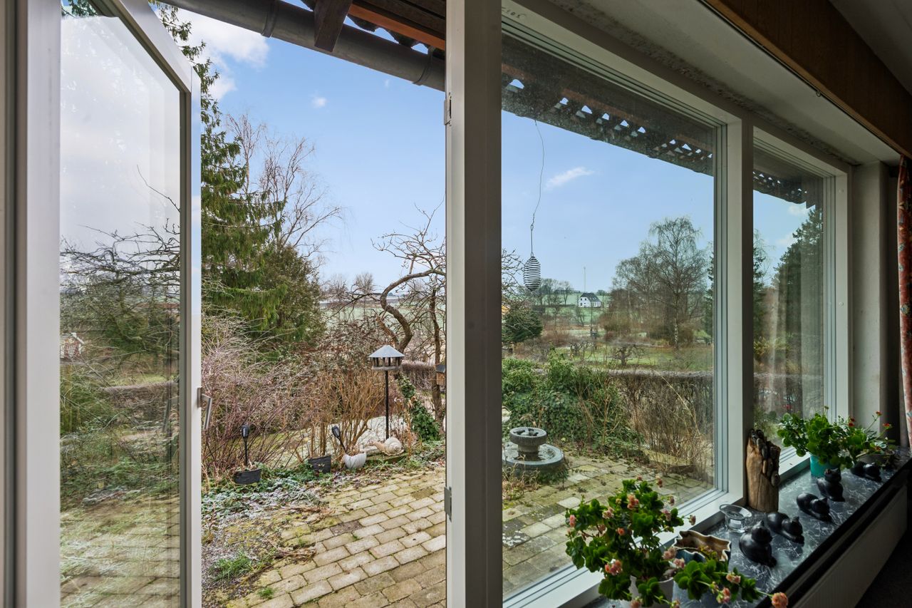 Vejen mod huset går ned ad en hyggelig, snoet grusvej, der løber langs åen, og I mærker straks, hvordan skuldrene sænker sig. Herfra drejer I ind på egen matrikel, hvor den gule murstensvilla ligger tilbagetrukket fra vejen og højt i landskabet, og I overtager altså et hjem med frit udsyn til alt det grønne omkring jer. Det er sjældent, at man støder på så stor en matrikel, men her på Åbrinken er grundene større end normalen.